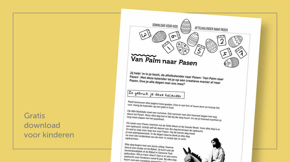 Deze aftelkalender Van Palm naar Pasen begint op palmzondag en eindigt op Tweede Paasdag. Op de eerste dag maak je samen een palmpasenstok. In de dagen daarna staan jullie stil bij alle elementen van de palmpasenstok (en mogen jullie steeds een onderdeel opeten!).