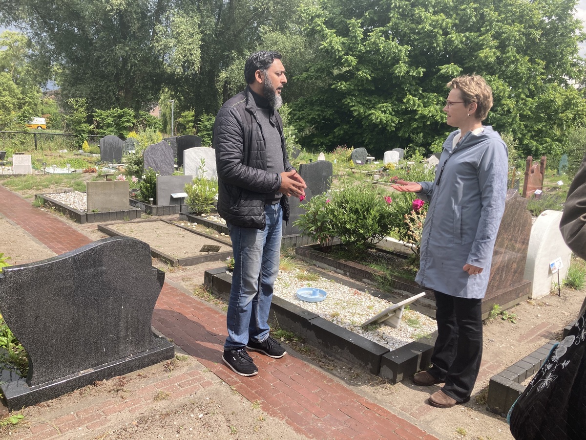 Omdat de begraafplaats steeds voller raakte, realiseerde de moskee in samenwerking met de gemeente Almere vorig jaar een nieuw deel, een stuk verderop gelegen. En wat bijzonder is: dit is een natuurbegraafplaats. We lopen erheen, het is inmiddels gelukkig weer droog, de zon breekt zelfs door. De verschillen met het oudere deel zijn groot: hier zijn veel meer bomen, grafstenen ontbreken en er is veel groen. Langzaam raken de graven bedekt door een dikke laag sedum. Volgens Mohamed is dat belangrijk: “Wanneer een graf begroeid is, dan wordt gezegd dat de bladeren gebedjes zijn die ten goede komen aan degene die daar begraven ligt.” Het is dat ik er hier niet tussen kom omdat ik geen moslima ben, anders zou ik wel begraven willen worden op deze prachtige plek.