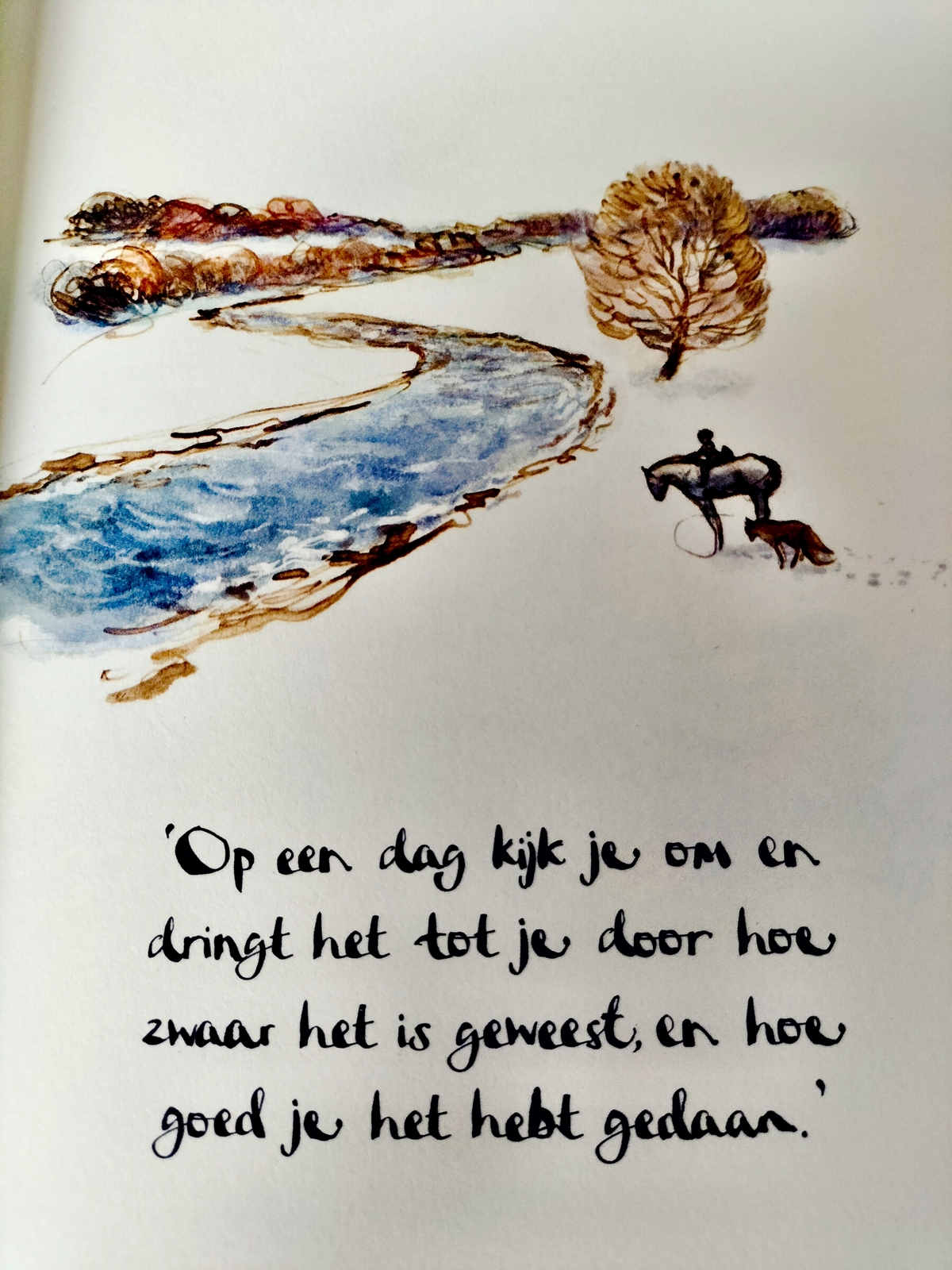 Ik vertel graag iets over de tekening op de pagina die nu openstaat. Er staat bij: Op een dag kijk je om en dringt het tot je door hoe zwaar het is geweest en hoe goed je het hebt gedaan. Op het plaatje zie je de vier vrienden uit de titel staan in een sneeuwlandschap, naast een rivier die langzaam kronkelt, de verte in. Dit plaatje raakt me omdat het onmiddellijk mijn hart verzacht. Wat moet dat een heerlijk gevoel zijn, als dát tot je doordringt.