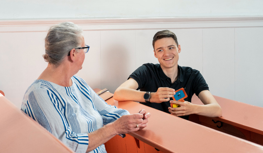 Annie: “Laat ik beginnen met een eigentijdse vraag. Welke rol spelen sociale media in jouw relaties?” “Die zijn wel belangrijk”, reageert Jac. gelijk. “Toen we niet naar school mochten, kon ik zo toch contact houden met vrienden. En als je je even verveelt, kun je met wat scrollen en swipen de hele wereld zien. Ik gebruik mijn telefoon wel tien uur per dag”, berekent hij – tot Annies afgrijzen. “Maar alles telt mee hè: video’s kijken, muziek luisteren … Je gebruikt je telefoon tegenwoordig voor alles. Zelfs voor de kerk!” Annie: “Dat is waar. Het eerste wat ik ‘s morgens doe, is in onze kerk-app checken of er iemand jarig is. Die app vind ik ont-zet-tend leuk. Misschien raak ik ook nog wel verslaafd …”