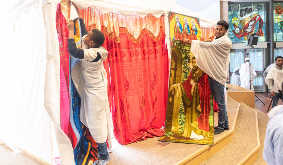 Teklemaryam (20) is hier al sinds 7.00 uur vanochtend. Als hij op zaterdag niet hoeft te werken, is hij de hele dag in de kerk te vinden. Om alles klaar te zetten en weer op te ruimen, en als begeleider van de jongerengroep (12 tot 16 jaar), in een aparte ruimte van de kerk. Hij leert de jongeren over rituelen in de kerk en over de betekenis van voorwerpen, maar hij leert hun ook om anderen te helpen en te respecteren, en iets te betekenen voor de samenleving.